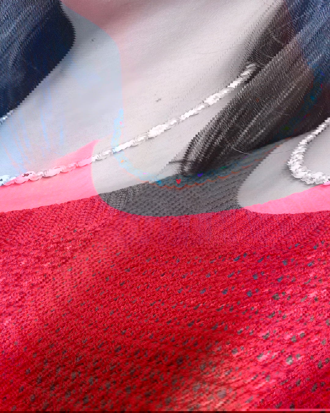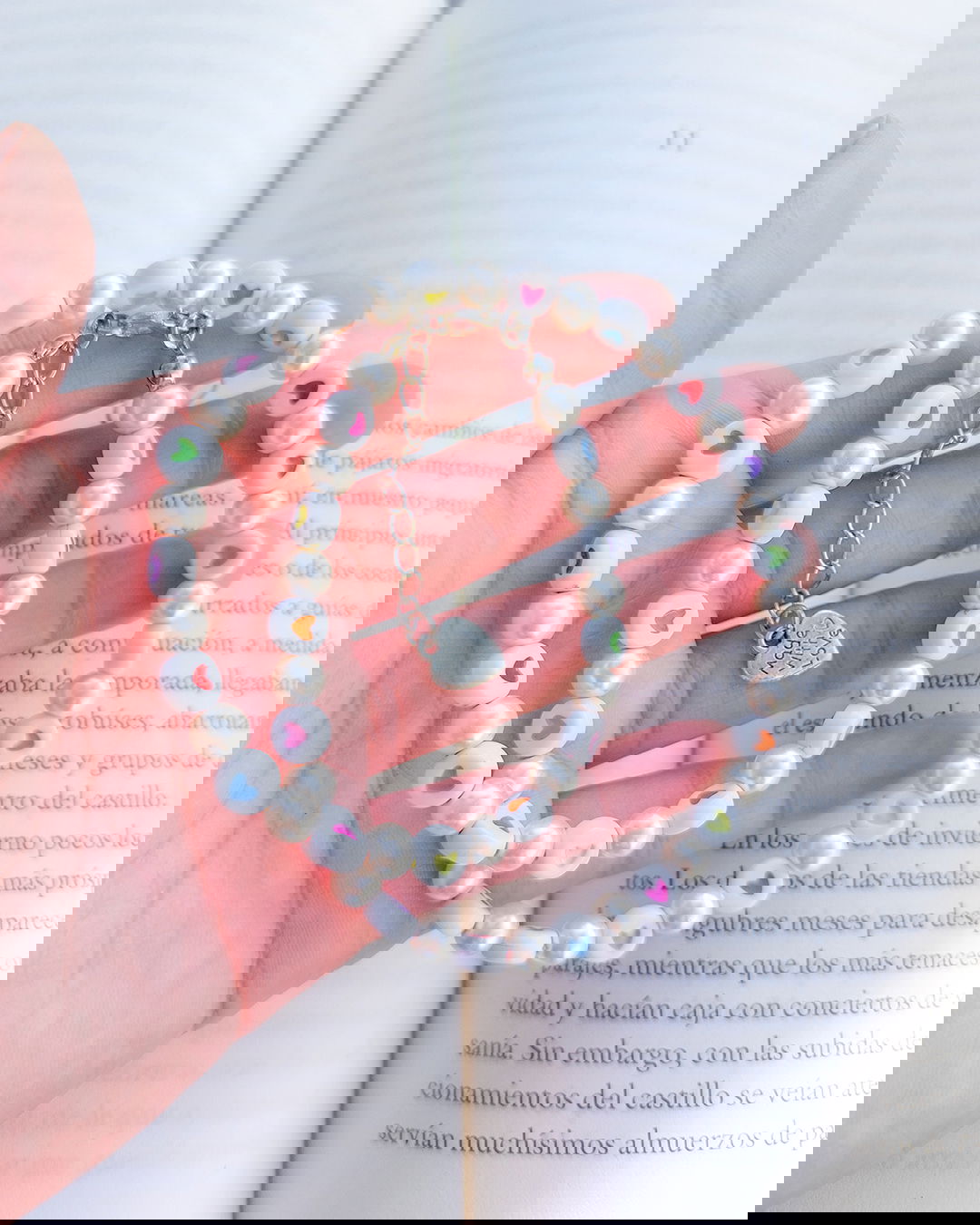 Collar de perlas de vidrio, bolitas de plástico con corazón de colores y detalles en aleación de metal.