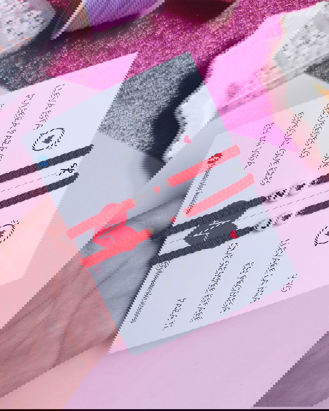Pulsera tejidas en hilo poliester con letras* de plastico duro y bolitas de aleación metal.