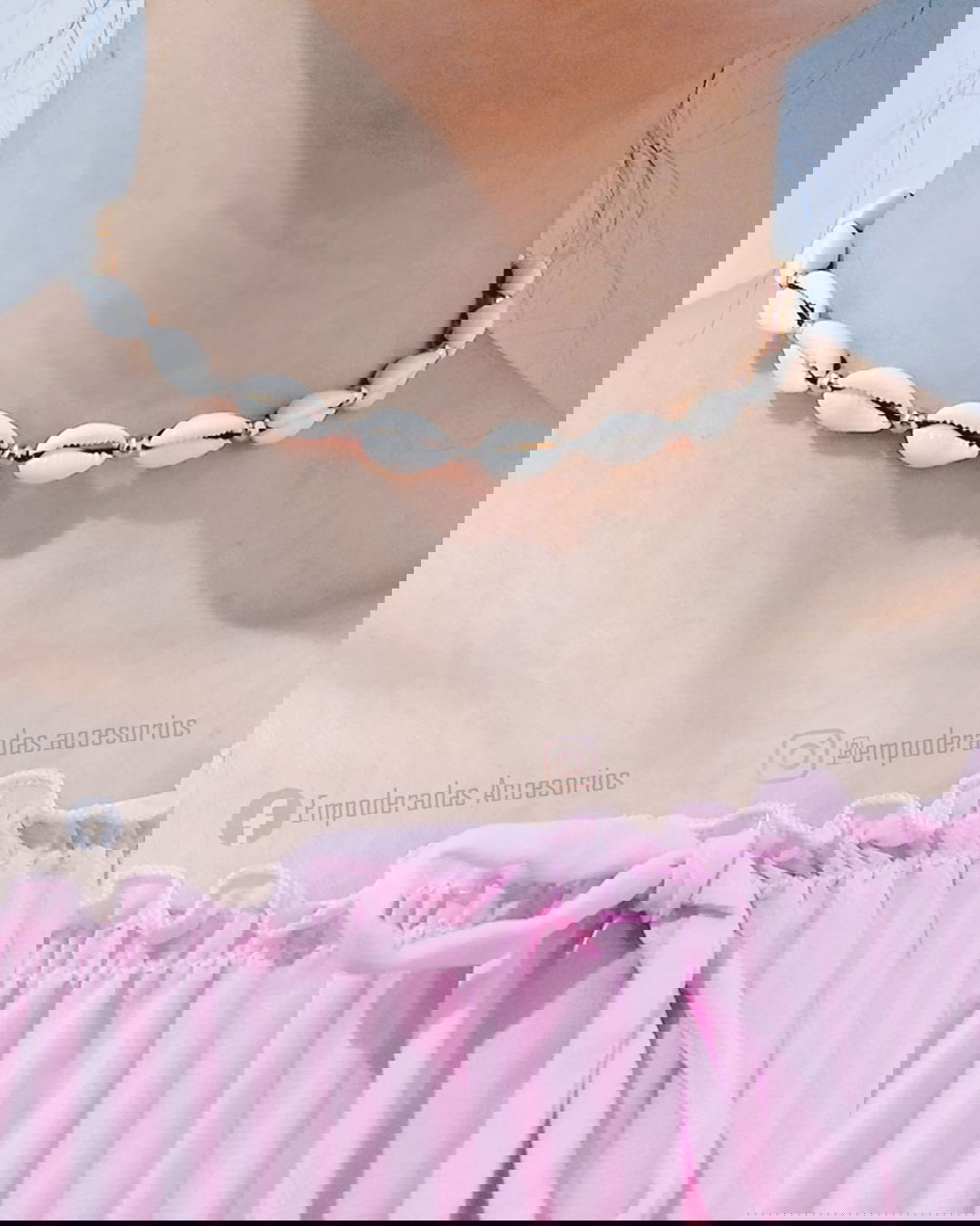 Choker con buzios naturales, bolitas de aleación metal e hilo de poliester.
