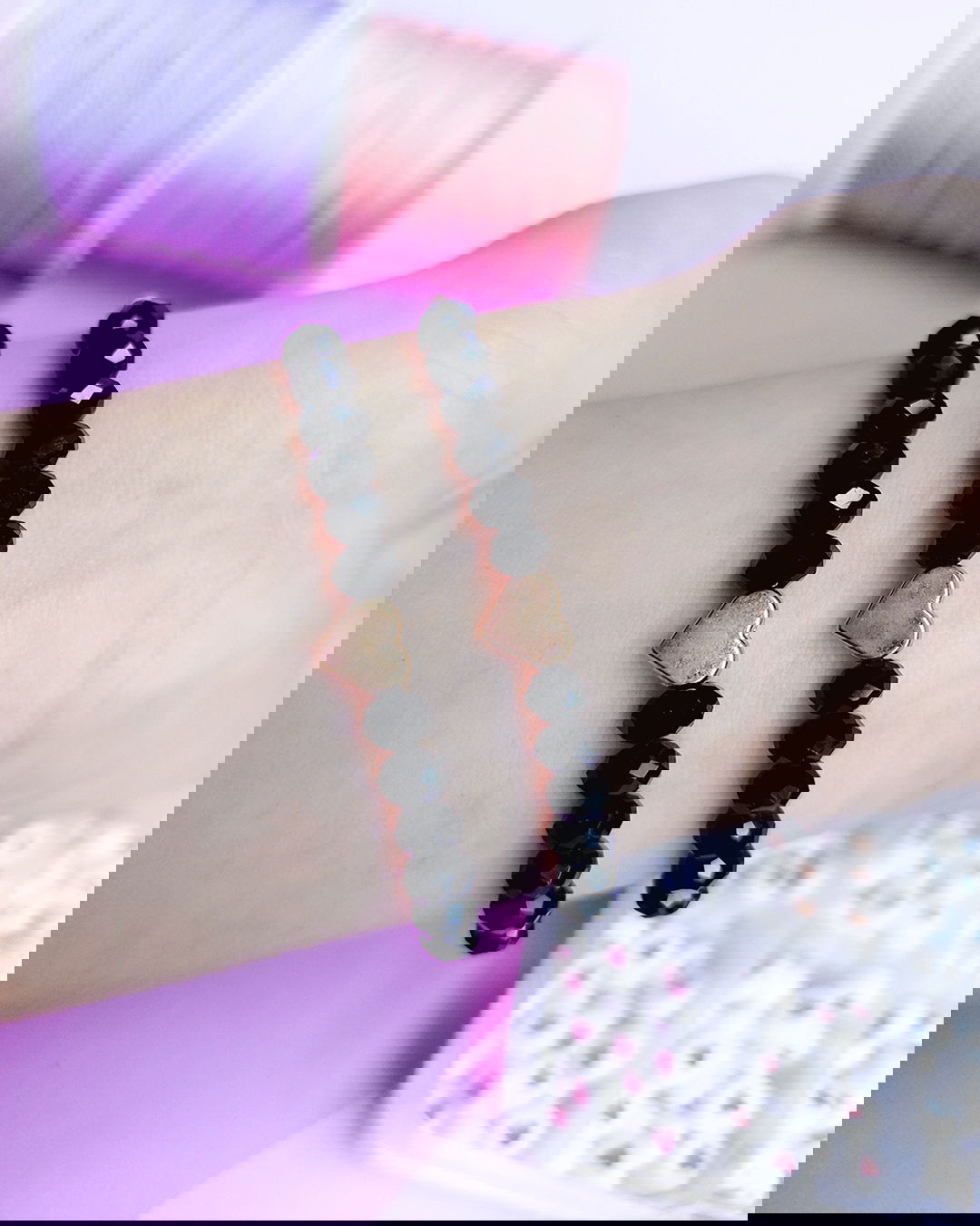 Pulsera tejida en hilo poliéster con letras de plástico duro, dije de aleación de metal y cristales (no plástico).