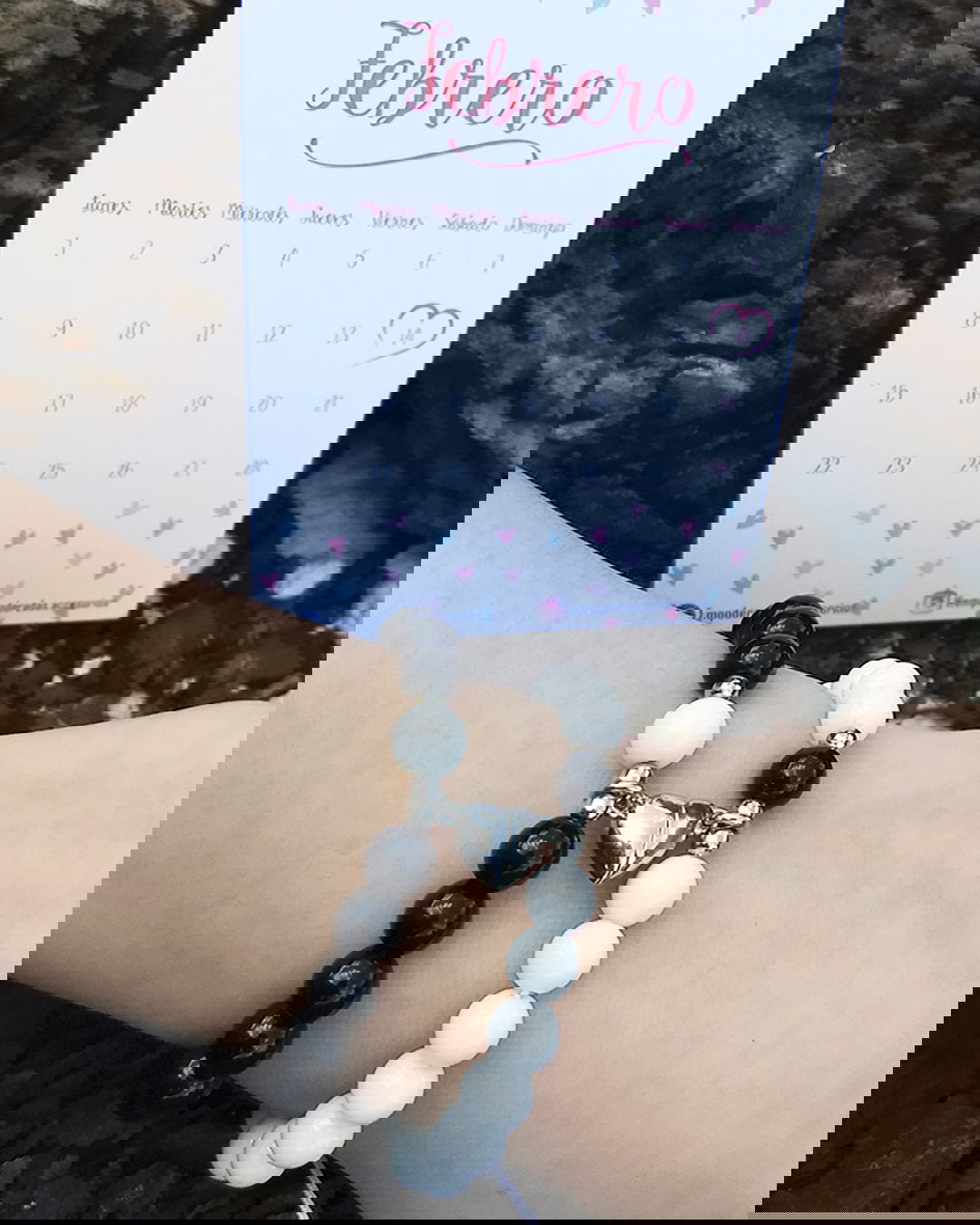 hilo poliester con perlas de vidrio, dije y bolita de aleación de metal.