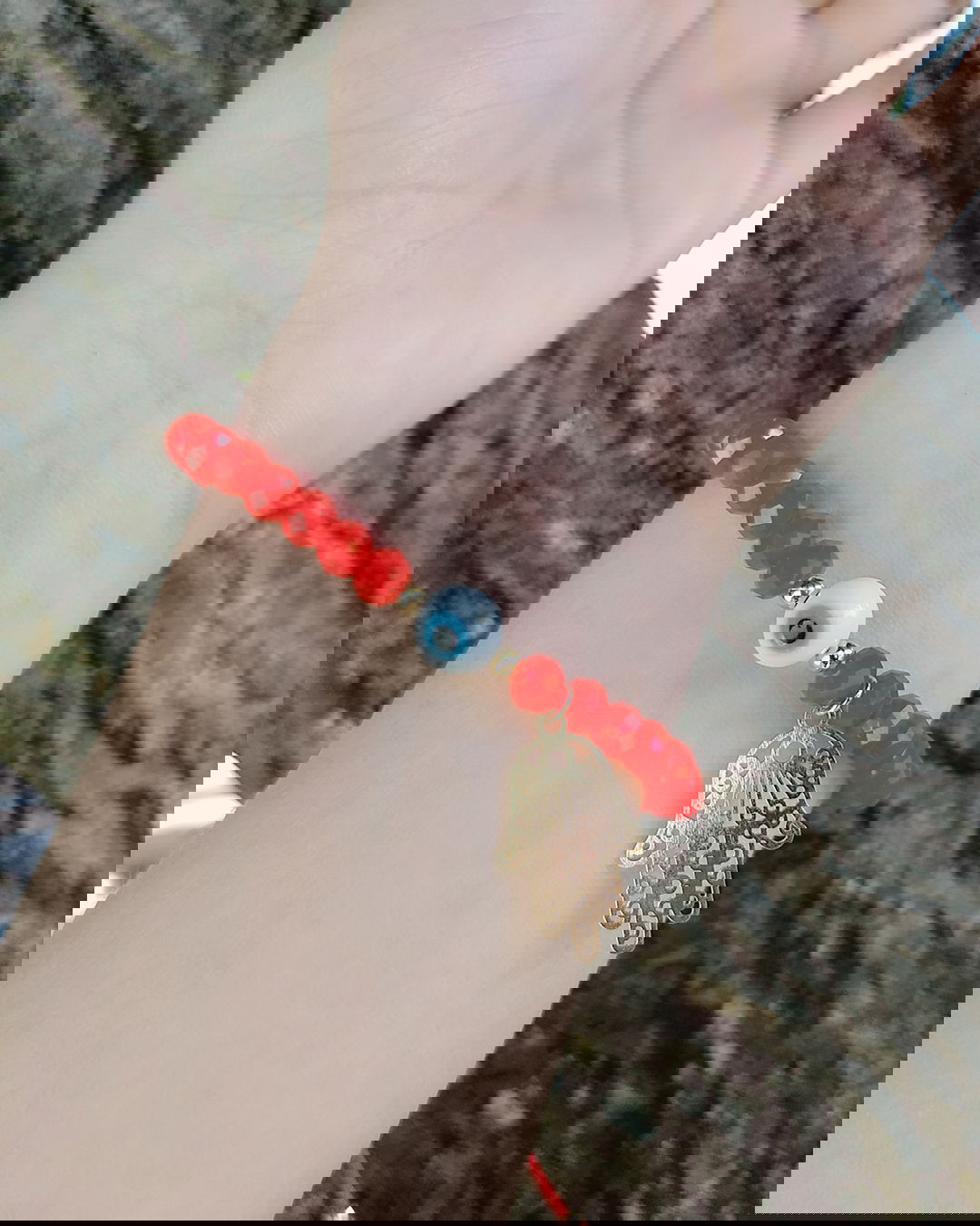 Pulsera en hilo poliester con cristales de vidrio, ojito turco de vidrio, dije hamsa y bolitas en oro goldfilled.
