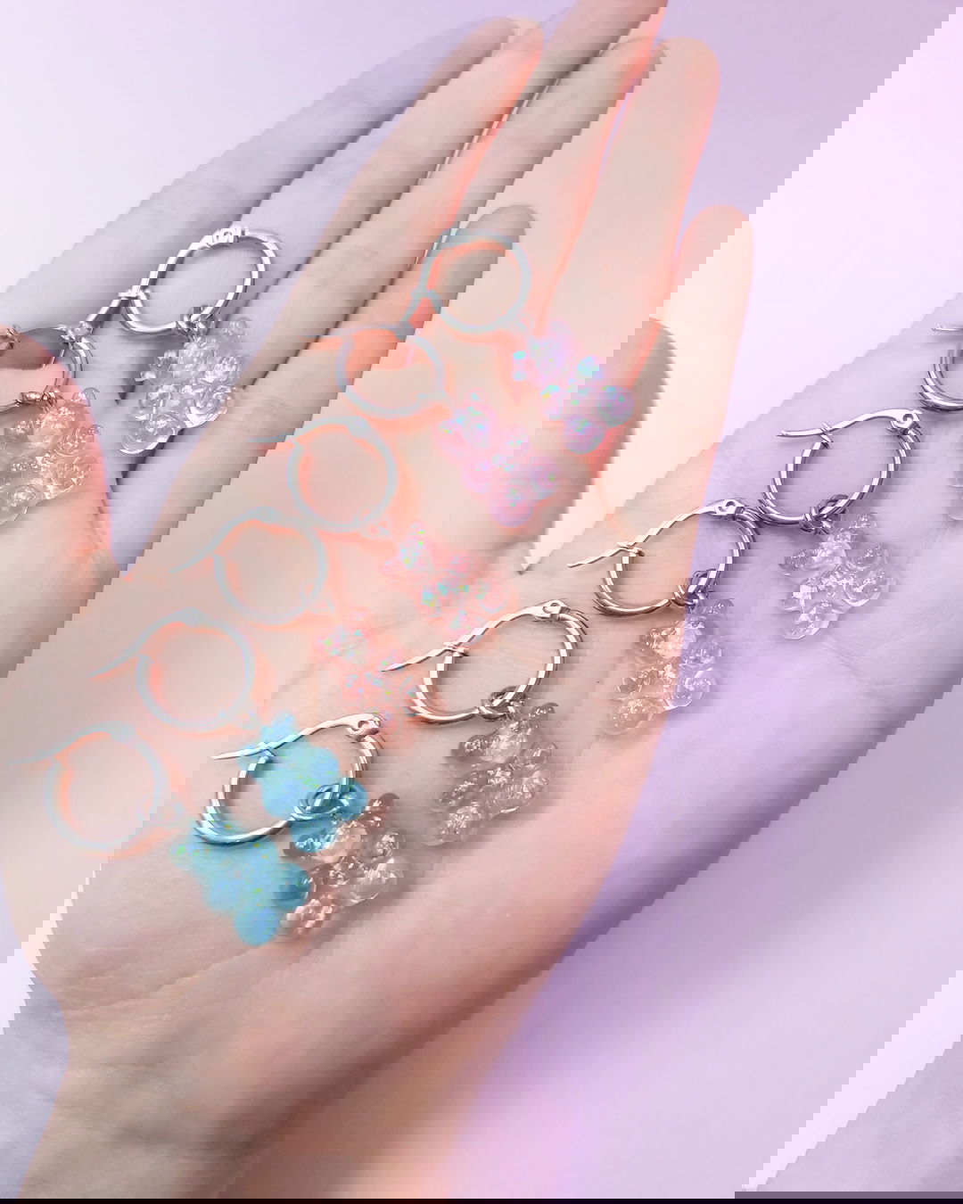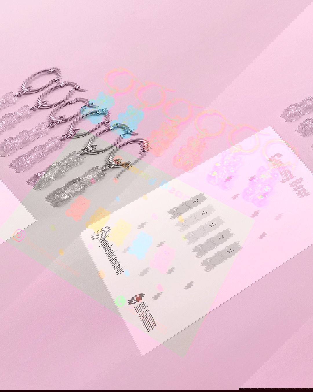 Argollas en acero quirurgico con dije osito gummy en resina.