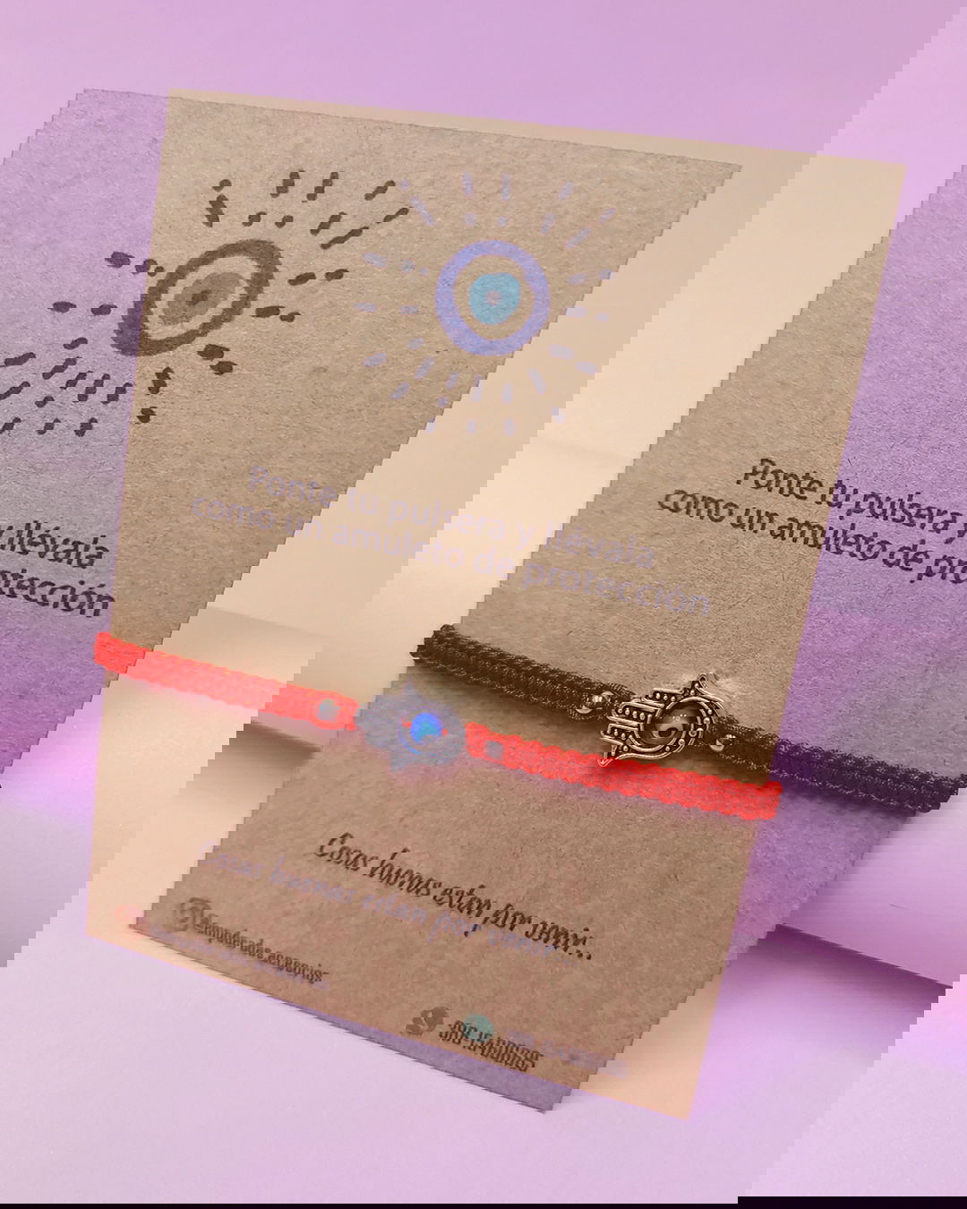 Pulsera tejida en hilo poliester con dijes de fundición con ojito turco de vidrio.